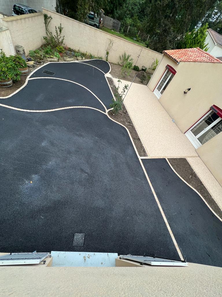 Pour ce projet, nous avons mélangé les matériaux avec un enrobé et une terrasse en marbre résiné.