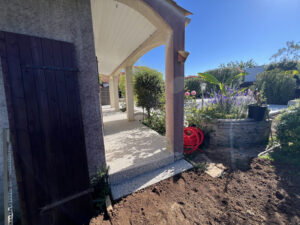 En retirant l’existant, notre entreprise de terrassement à Royan a pu repartir sur une base propre et cohérente. C’est aussi le bon moment pour vérifier les niveaux, anticiper les zones de passage, et préparer le support de façon à obtenir un résultat régulier sur toute la surface. Sur 90 m², cette étape est déterminante : le moindre défaut se voit, surtout avec un revêtement décoratif comme la moquette de pierre.