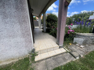 Le dernier volet du chantier concernait une zone technique et très visible : le porche, avec marche et contre-marche. C’est souvent là que la qualité d’un chantier se reconnaît : les surfaces horizontales sont une chose, mais les reliefs demandent plus de précision.
