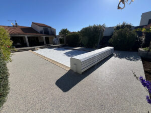 Sur cette réalisation, nous avons effectué une rénovation complète en moquette de pierre (résine drainante en Charente Maritime) sur 90 m², en 5 jours, en traitant à la fois la plage de piscine et une zone particulièrement visible et exigeante : un porche avec marche et contre-marche.
