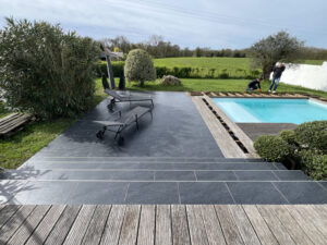 Cette étape est importante pour deux raisons. D’abord, elle permet une continuité esthétique : au lieu d’avoir un revêtement sur la plage et un autre matériau sur les marches, l’ensemble devient cohérent. Ensuite, elle améliore la perception de finition : les transitions sont plus propres, plus régulières, et l’espace piscine semble réellement “terminé”.