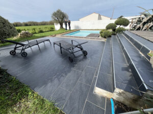 Une fois la base prête, nous avons procédé à la pose de moquette de pierre sur la partie horizontale, c’est-à-dire la plage de piscine. C’est la zone la plus visible et la plus utilisée : celle où l’on marche, où l’on pose les transats, où l’on circule entre la maison, la terrasse et le bassin.