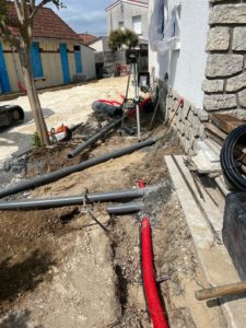 Un bel extérieur commence rarement par la finition : il commence par ce qu’on ne voit plus une fois le chantier terminé. Ici, le projet a intégré le terrassement et la pose de réseaux techniques, un point crucial pour anticiper les usages (éclairages, arrivées/évacuations, attentes pour des équipements, etc.). Le terrassement fait effectivement partie des travaux “préparatoires” qui sécurisent la suite du chantier en stabilisant le terrain et en évitant tassements ou désordres ultérieurs.