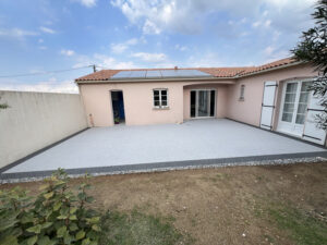 Tout part du support. Un sol instable, fissuré ou mal nivelé compromettra la durabilité de votre moquette de pierre à Royan. Le support doit être propre, sec, dégraissé et exempt de remontées d’humidité. Pour une terrasse existante, un ragréage peut s’avérer nécessaire. Sur terre-plein, une dalle béton parfaitement lissée constitue la base idéale ; un bon diagnostic initial évite 80 % des problèmes futurs.